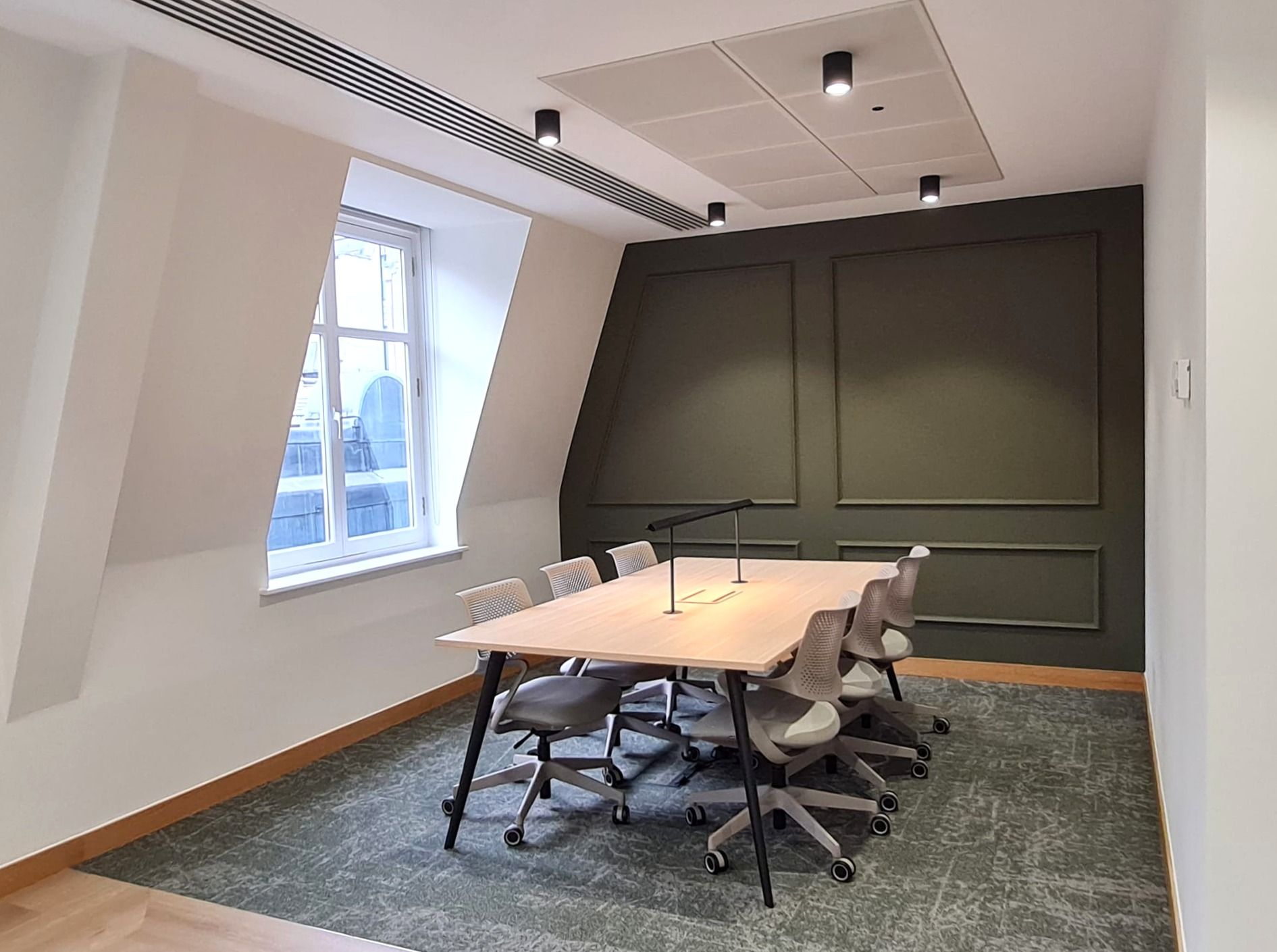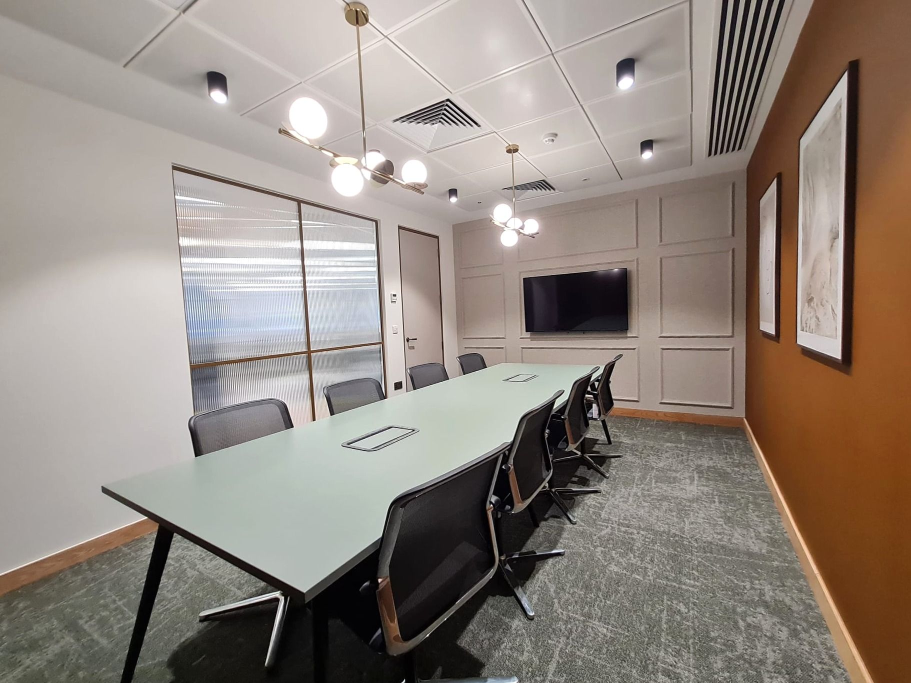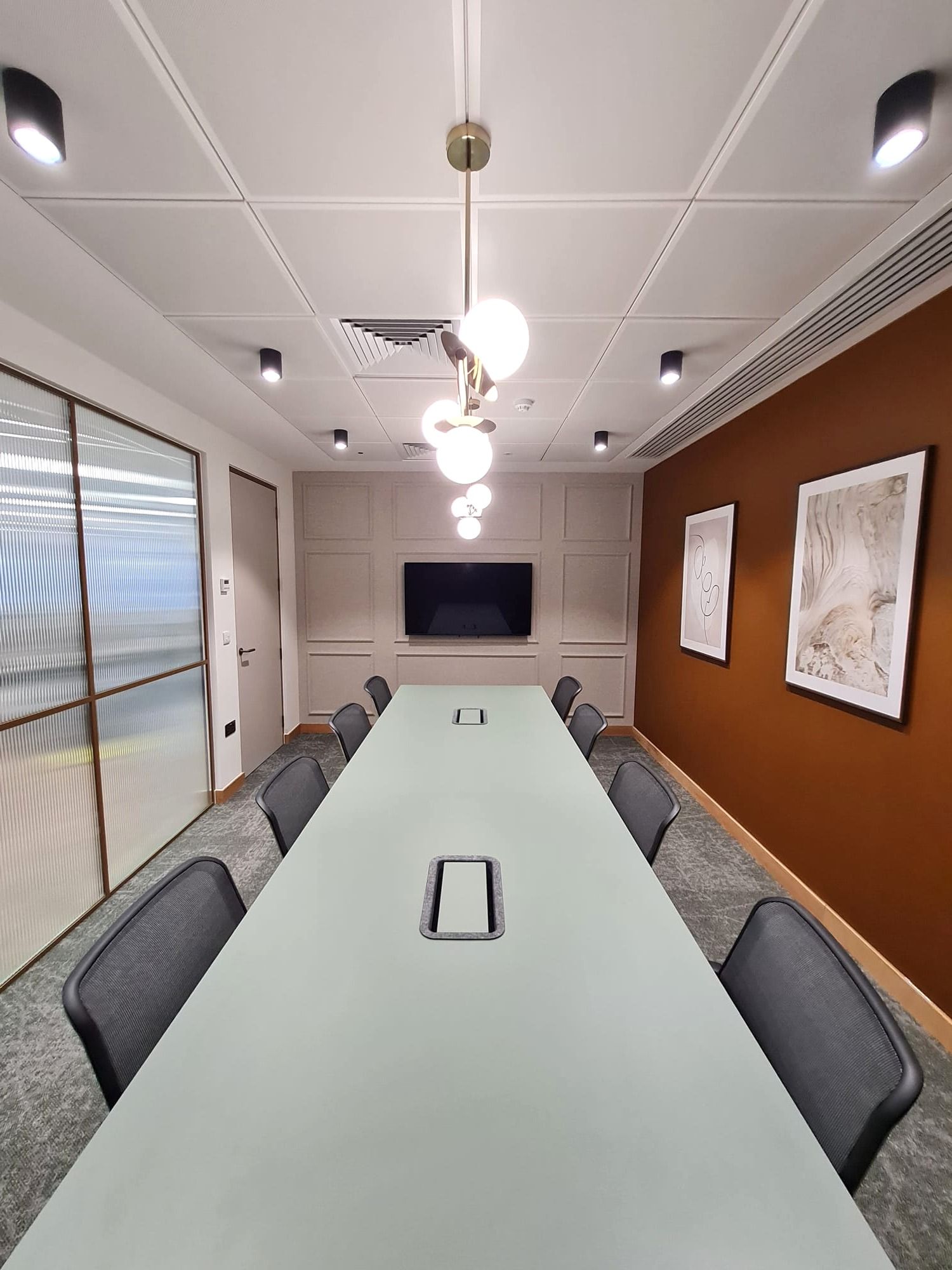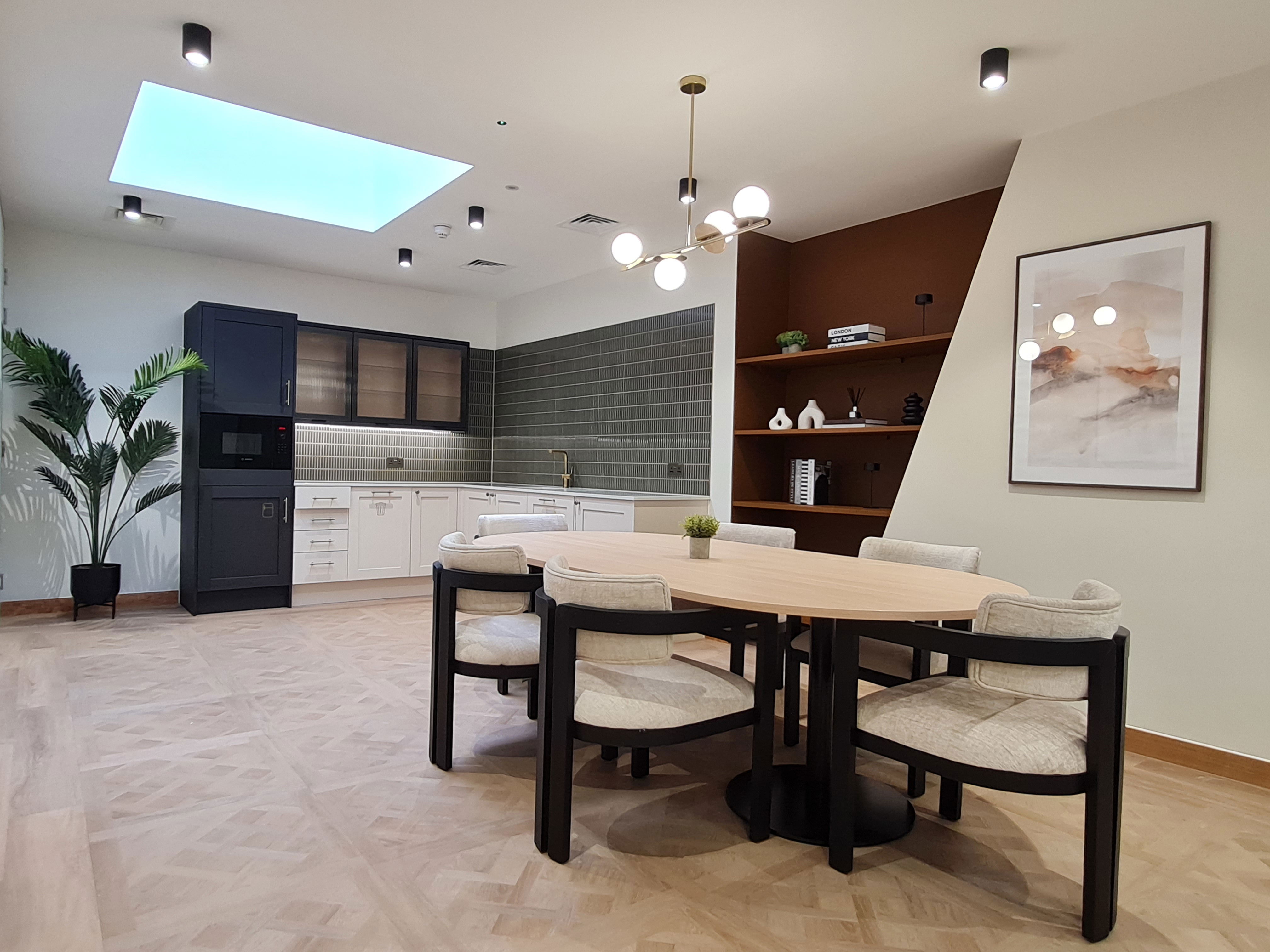 Feature pendant, can lighting and LED strip lighting in tea point and breakout area.